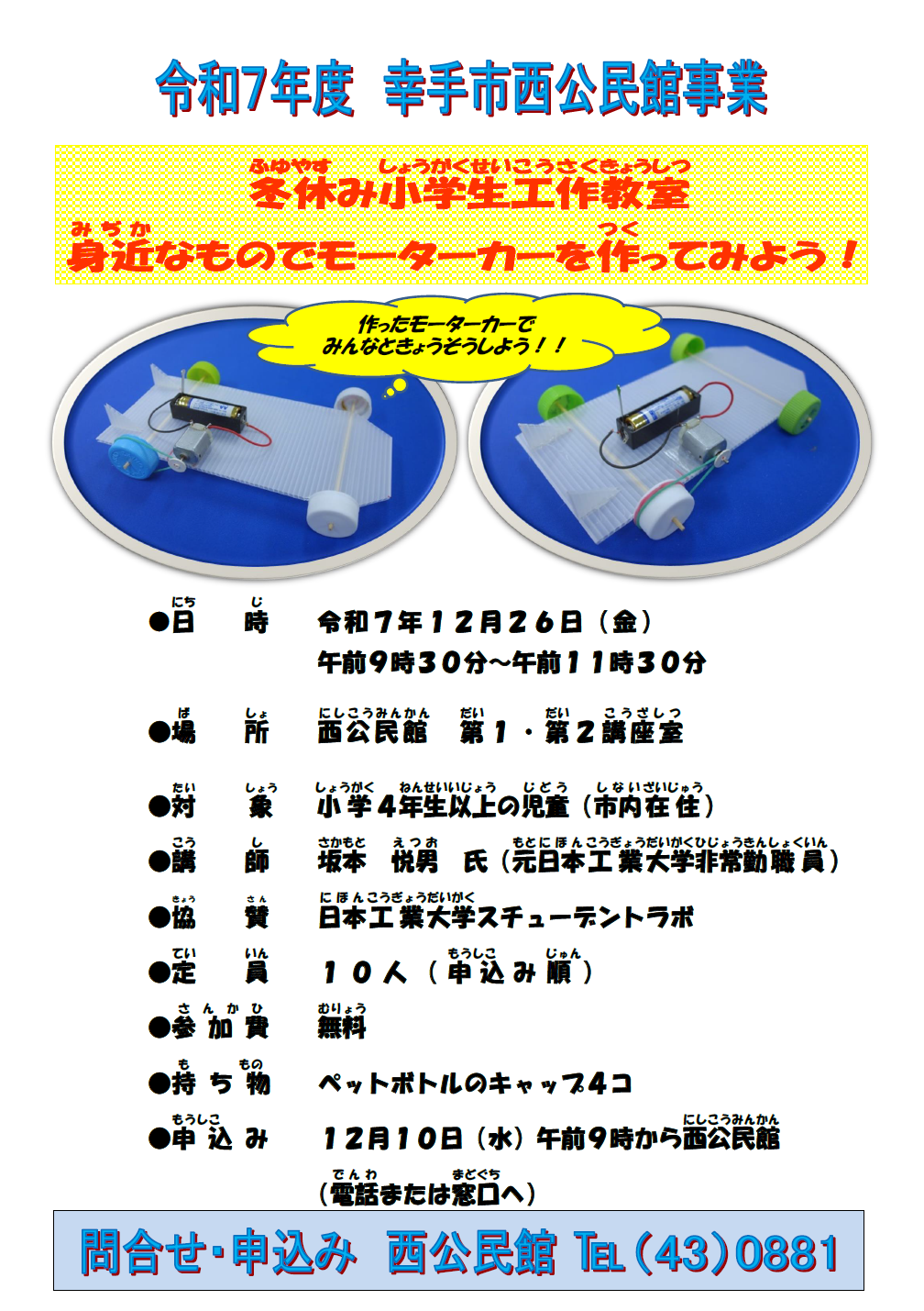 冬休み小学生工作教室~身近なものでモーターカーを作ってみよう!~(西公民館)