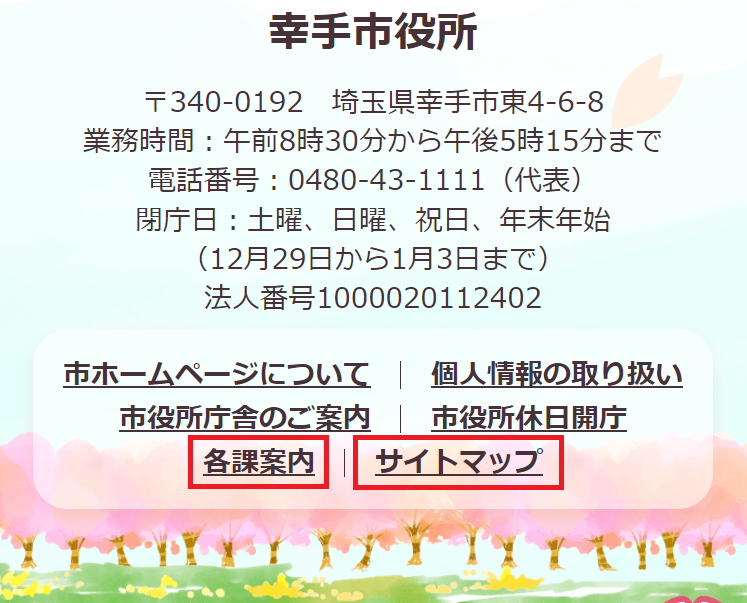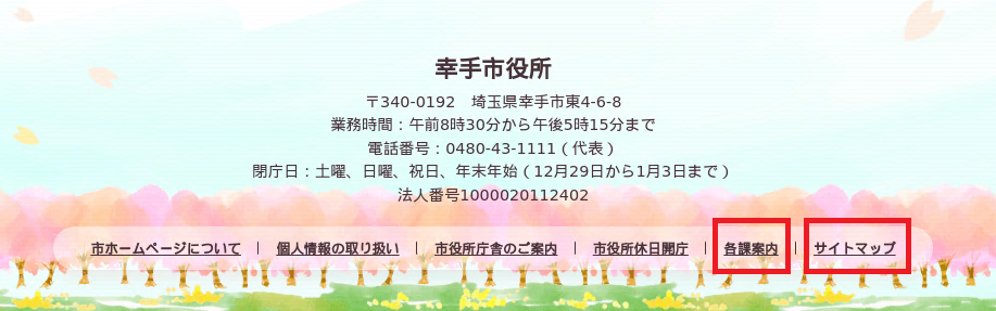 ページを一番下までスクロールしていただき、「各課案内」または「サイトマップ」から探す。