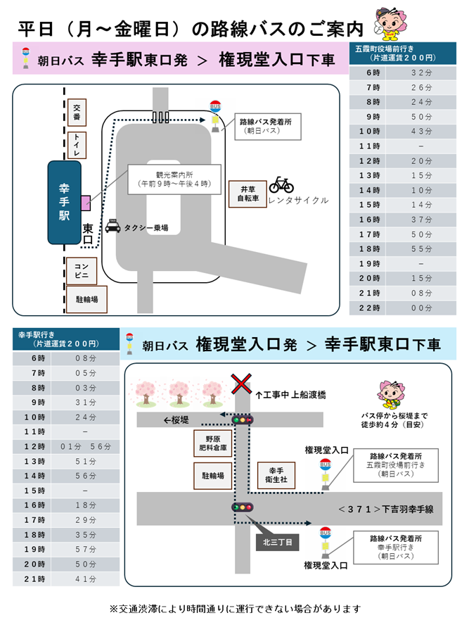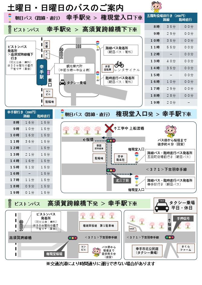 ※土日のみ(3月28日、29日、4月4日、5日、※11日、※12日)、「幸手駅」から「権現堂入口」までの臨時直行バスが走ります(※は状況に応じて運行)