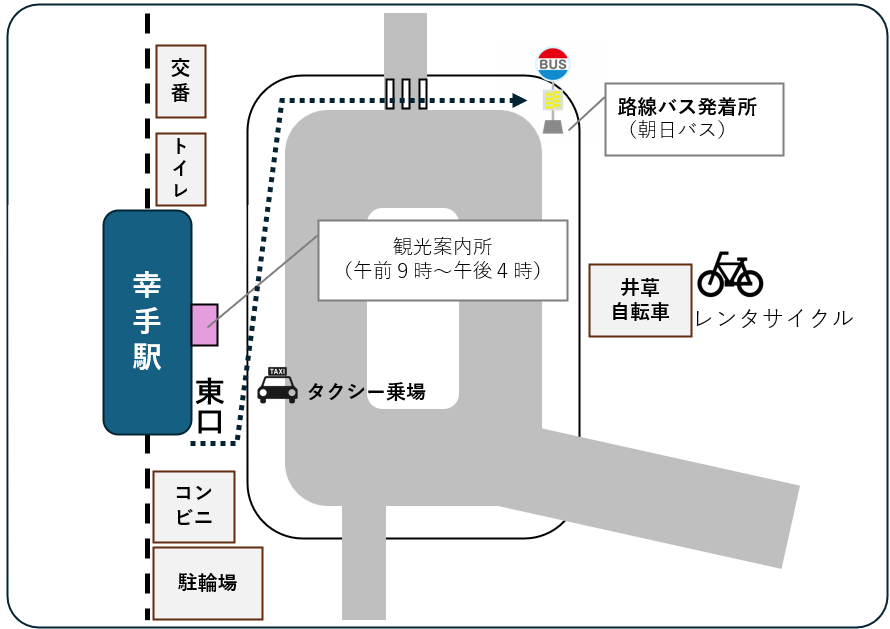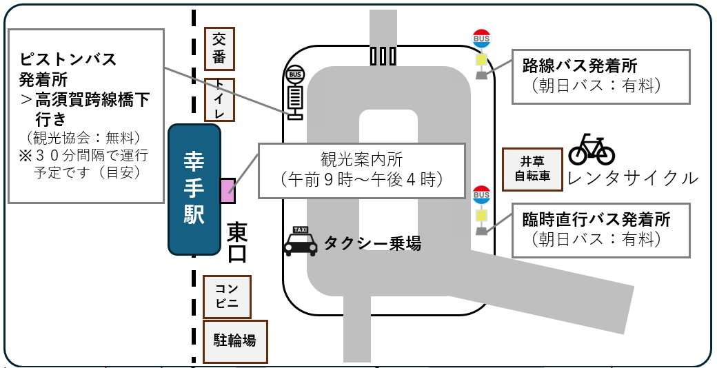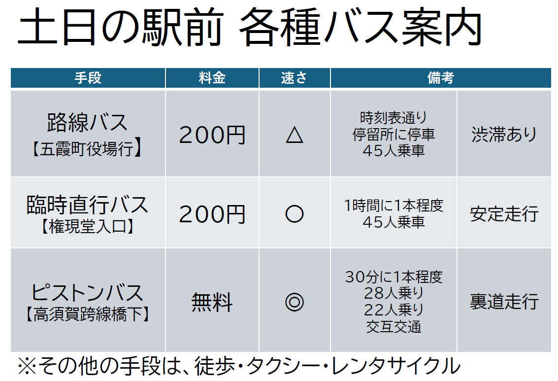 路線バス、タクシー、レンタサイクルに加え、臨時直行バス(朝日バス)、ピストンバス(観光協会)が臨時的に運行します。